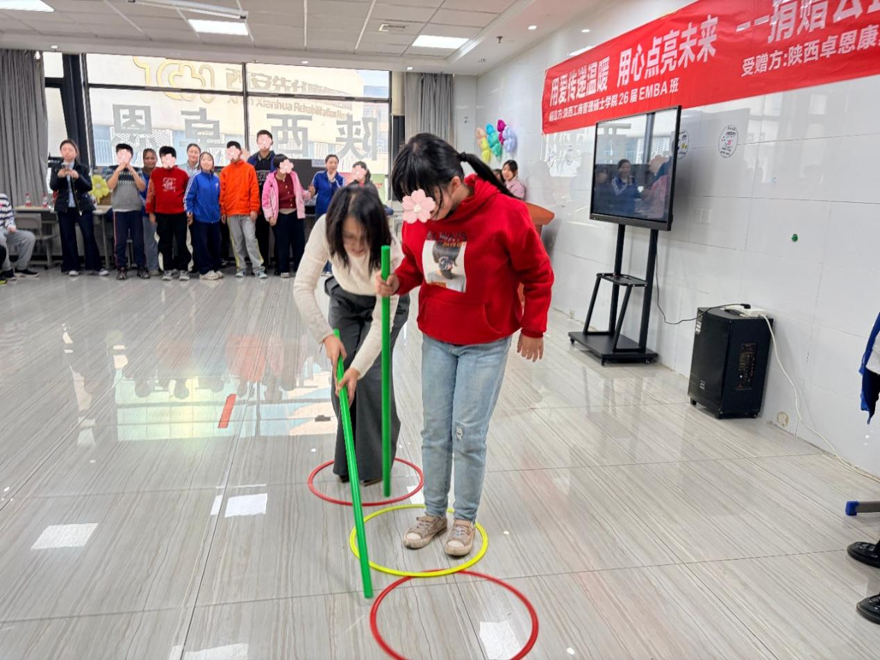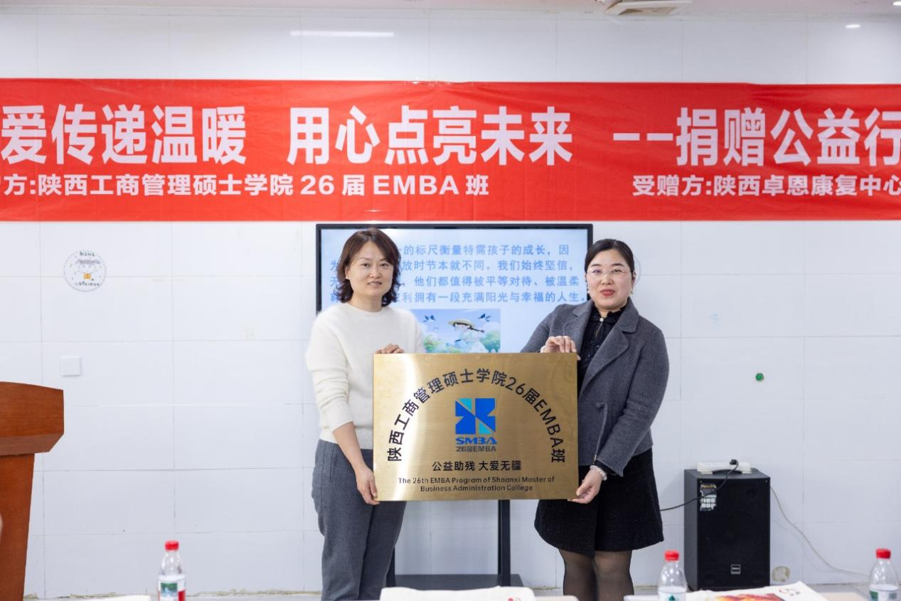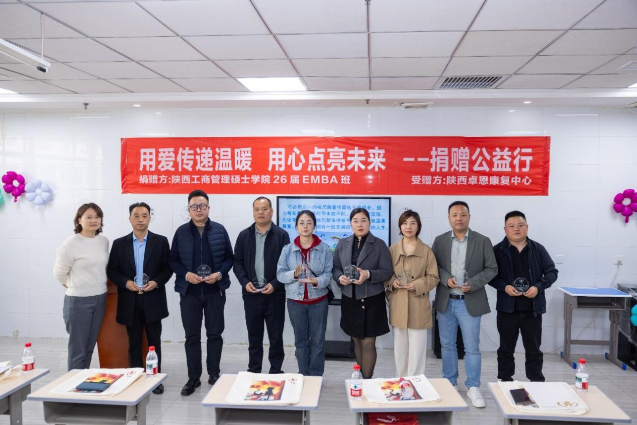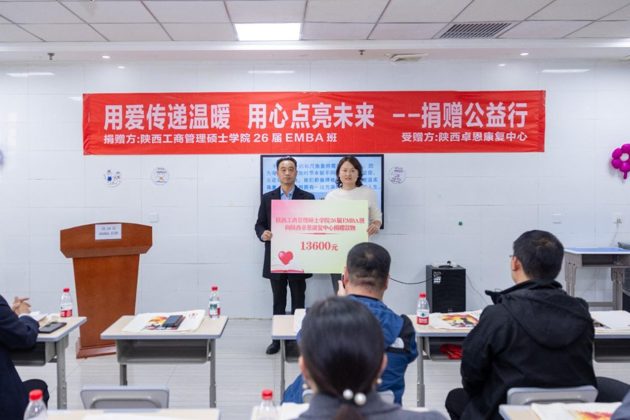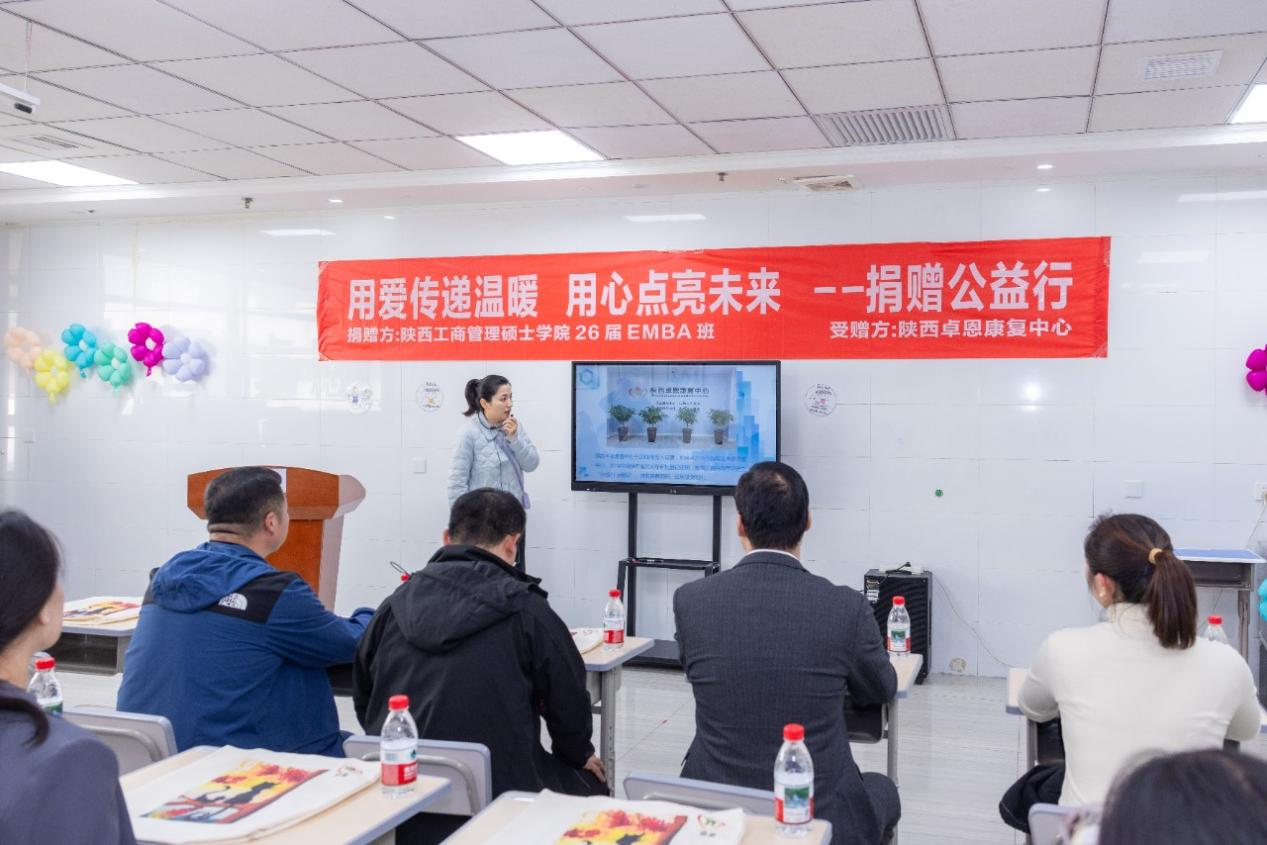 11月13日,陕西工商管理硕士学院党委委员、学生工作部部长、招生办公室主任折保宏,第26届EMBA班主任白净以及班级30余名同学,一同走进第26届EMBA倪娟同学创办的陕西卓恩康复中心,开启了“用爱传递温暖,用心点亮未来——捐赠公益行”活动。