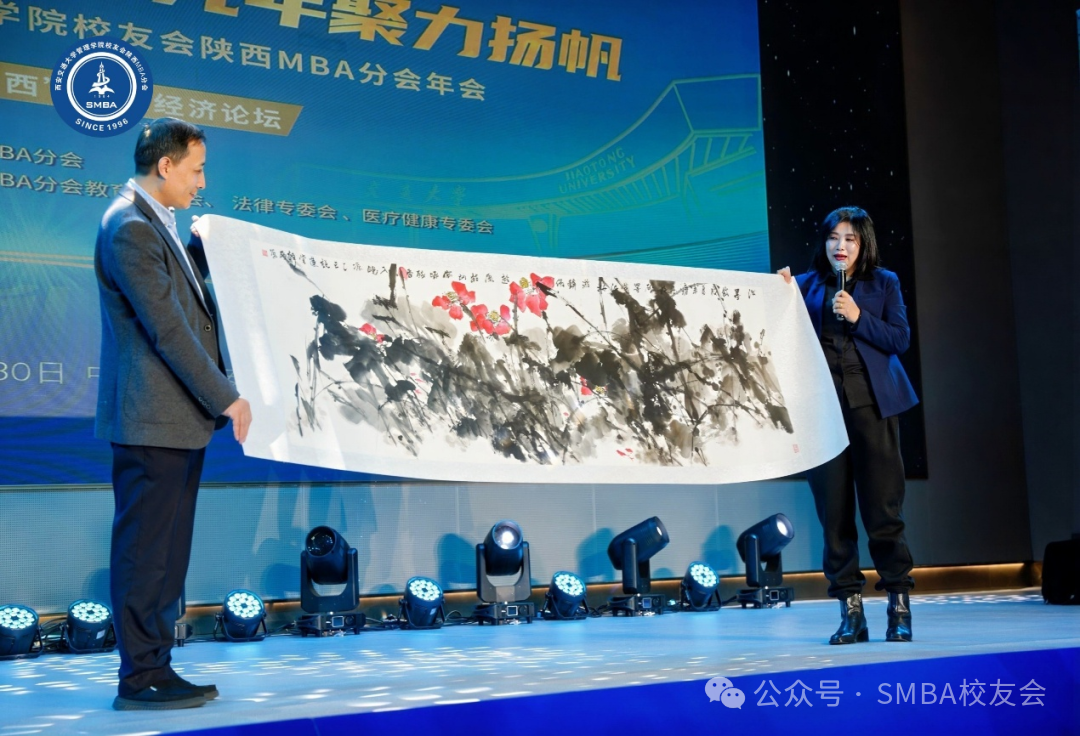 笔墨传情,丹青寄意。在本次年会上,徐悲鸿关门弟子、国家一级美术师李孟老师和陕西以琳书画院院长韩丽老师特意为本次年会创作了书画作品,赠予管理学院。作品笔墨间凝聚着校友对母校的赤子情怀,更承载着各界友人对管理学院未来发展蒸蒸日上、再创辉煌的美好祝愿。