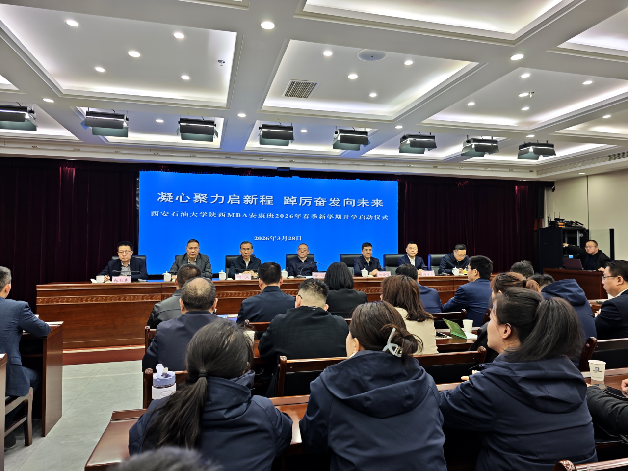 28日上午,西安石油大学陕西MBA安康班举行了2026年开学启动仪式,安康市委常委、组织部部长韩晓晖和汉滨区区长向诗兵出席。常江代表学校致辞,他向长期以来关心支持学校建设发展的安康市各级领导致以衷心的感谢,向怀揣进取之心、重返学习殿堂、顺利开启新学期征程的全体同学致以诚挚的问候和热烈的祝贺,他介绍了西安石油大学的办学特色和办学成就,并对全体同学提出三点希望:一是做“铁人精神”的传承者,厚植家国情怀,把个人成长与地方发展、国家需求紧密结合。二是做“知行合一”的践行者,立足工作实际钻研管理新知,把理论知识转化为破解难题、推动发展的实干本领。三是做“校地合作”的推动者,以班级为纽带加强交流互鉴,凝聚智慧力量,助力校地共赢发展。