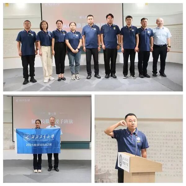 郭云涛副院长为新生代表佩戴西北工业大学校徽,为2025级陕MBA班授予班旗,并合影留念。